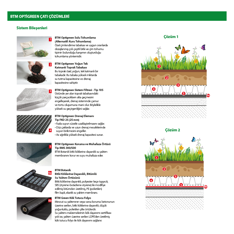 BTM Optigreen sistemleri, yalnızca çevresel faydalarıyla değil, yapıların korunmasına sağladığı katkılarla da öne çıkmaktadır. Su yalıtımı, drenaj ve koruma katmanlarından oluşan sistem yapısı; uzun ömürlü performans hedefiyle tasarlanmakta ve yapıların dış etkenlere karşı dayanımını artırmaktadır. Estetik ile fonksiyonelliği bir araya getiren yeşil çatı uygulamaları, modern mimarinin çevreyle uyumlu çözümler üretmesine olanak tanımaktadır.