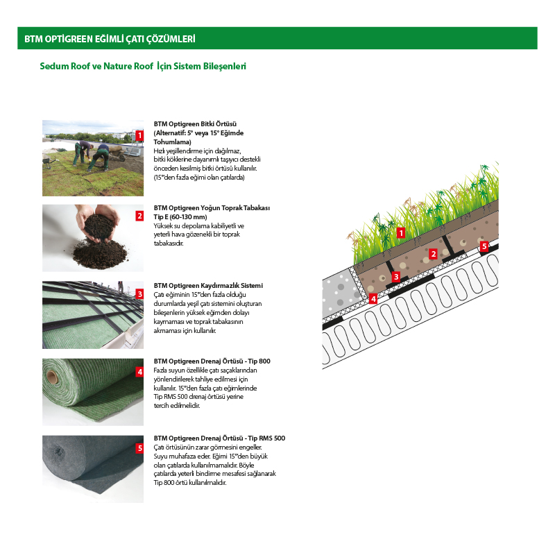 BTM Optigreen Yeşil Çatı Sistemleri, şehirlerin giderek yoğunlaşan beton dokusu içinde doğayla uyumlu çözümler sunarak yaşam alanlarına yeni bir bakış açısı kazandırmaktadır. Yeşil çatılar; bitki örtüsü sayesinde çatılarda doğal bir yalıtım tabakası oluşturarak ısı yükünün azaltılmasına katkı sağlamakta, bu sayede enerji verimliliğini desteklemektedir. Aynı zamanda yağmur suyunun tutulması ve kontrollü şekilde geri kazandırılmasıyla sürdürülebilir su yönetimine katkıda bulunmaktadır.