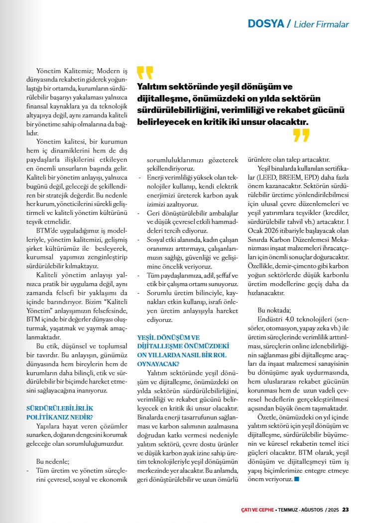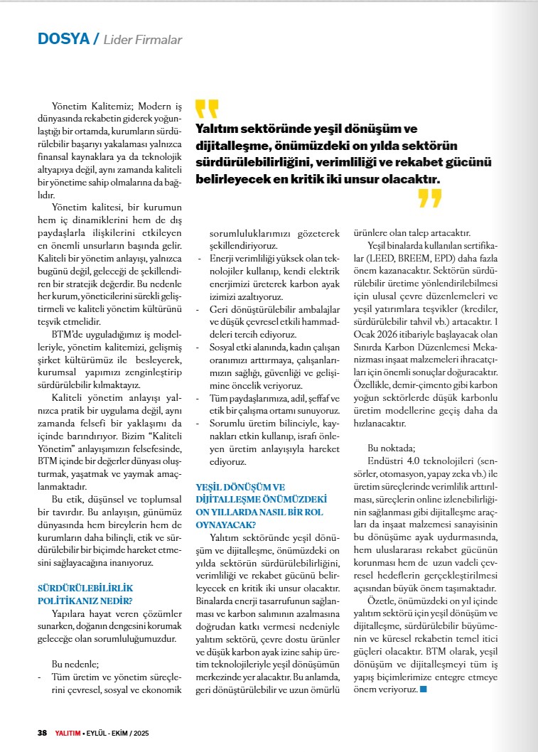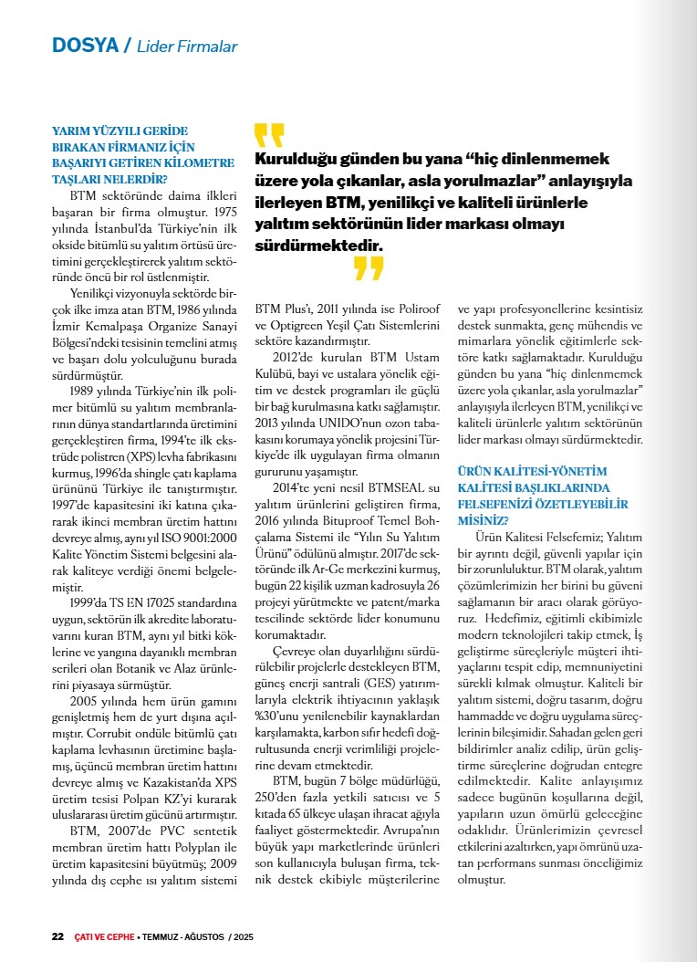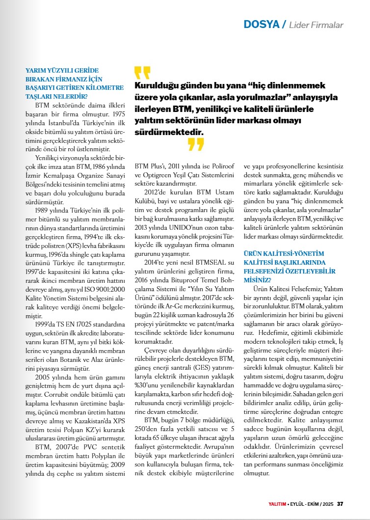 BTM Bitümlü Tecrit Malzemeleri Sanayi ve Ticaret Anonim Şirketi olarak internet sitemizin işlemesini sağlamak için yasal düzenlemelere uygun çerezler kullanıyoruz. “Kabul Ediyorum” butonunu tıklamanızla birlikte; internet sitemizin kullanıcıyla uyumlu hale getirilmesi, performansının iyileştirilmesi, sizleri doğrudan tanımlayacak veriler olmamak kaydıyla kullanıcı davranışlarının analiz edilmesi ve kişiselleştirilmiş reklam faaliyetlerinin gerçekleştirilmesi amaçlarıyla çerezlerin kullanılmasını kabul etmiş olursunuz. Çerezlere ilişkin detaylı bilgiye Çerez Politikası’ndan ulaşabilirsiniz. Tarayıcınızın “Çerezler” bölümünden her zaman tercihlerinizi yönetebilirsiniz. KABUL ET
